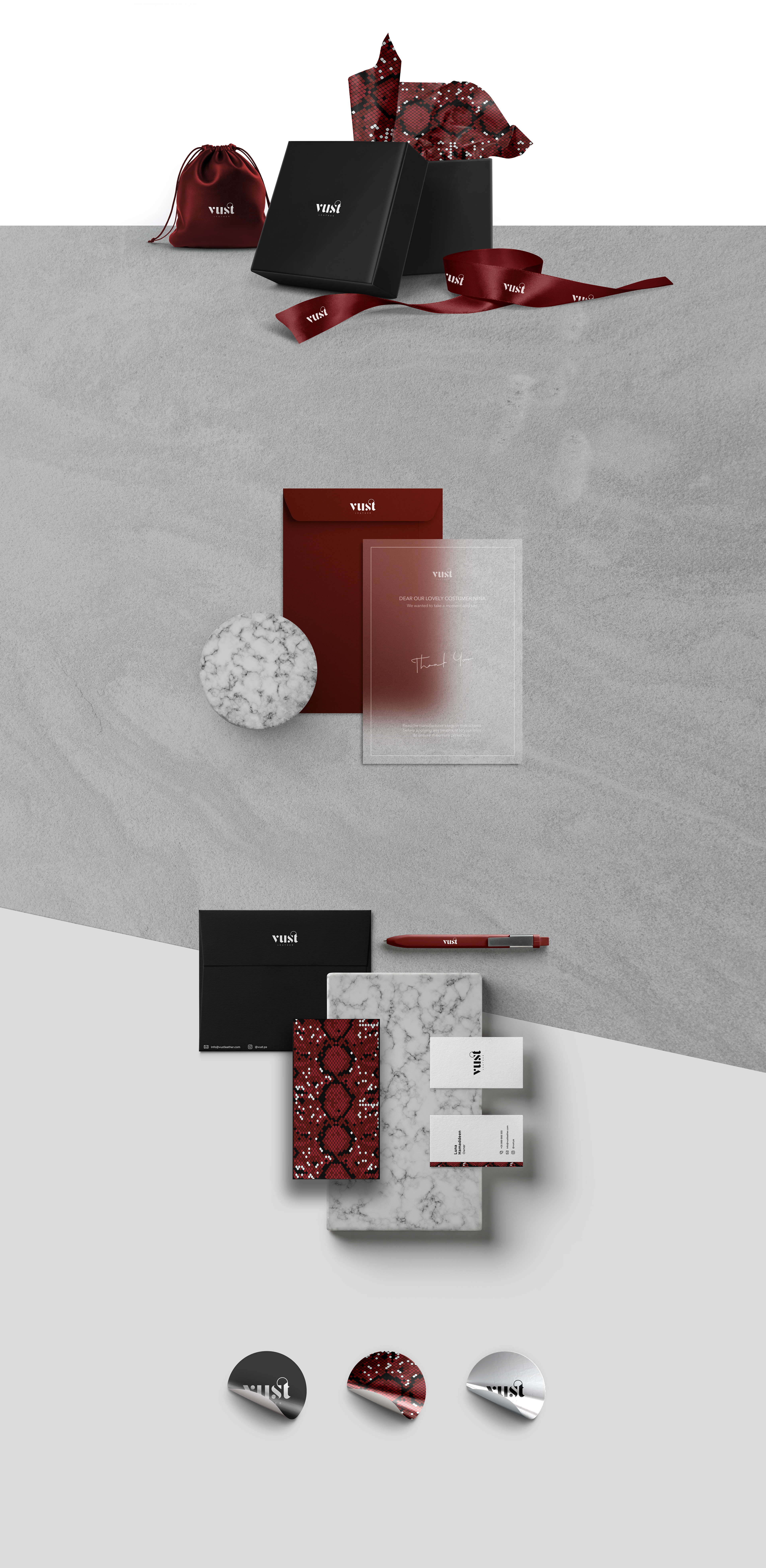 Vust leather is a leather workshop And the word Vust means emotions that are similar to "love", but much more serious and not to be said continuously or lightly. The Logo and the brand identity design meant to reflect Vust's elegance, minimalism, and its high quality.